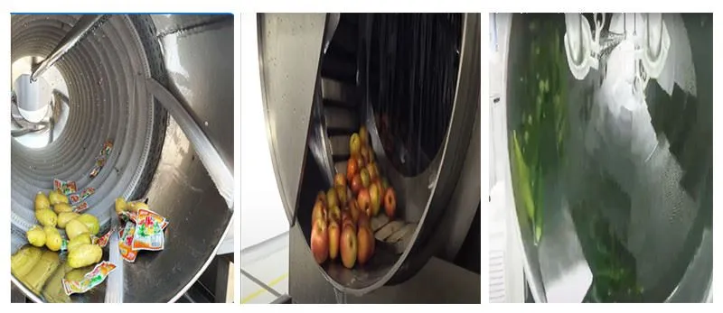 Después de que los materiales entren en el rodillo, bajo el funcionamiento de la hoja en espiral, los materiales ruedan y avanzan. El dispositivo de rociado de alta presión inyecta burbujas de aire a alta velocidad en la columna de agua. Cuando entra en contacto con el material, la burbuja se rompe y genera energía para lavar los materiales y también empujar los materiales al rodillo del cepillo. El cepillo cilíndrico puede eliminar completamente cualquier impureza, como el cabello. Luego, los materiales van a la jaula del rotor y eliminan los desechos o insectos que flotan en el agua. Por último, los materiales se enjuagan con agua pulverizada y se transportan al siguiente proceso.