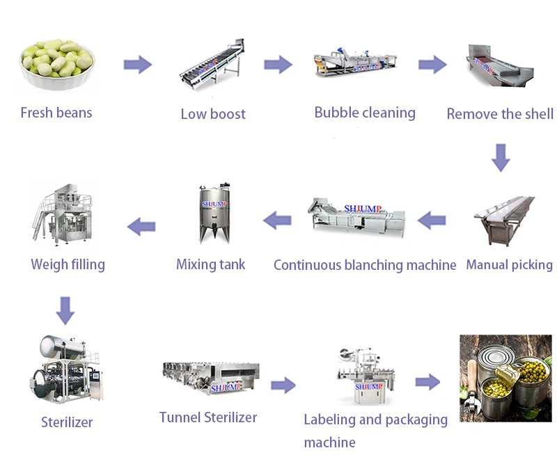 Especificación de procesamiento de frijoles enlatados SHJUMP: 2. Descripción general del proyecto de procesamiento de frijoles enlatados SHJUMP: Los frijoles contienen proteínas, fibra, folato y muchos minerales, como hierro, magnesio, potasio y zinc. Nuestro SHJUMP ofrece una máquina de procesamiento de frijoles enlatados de línea completa. En conserva, las alubias se escaldan;...