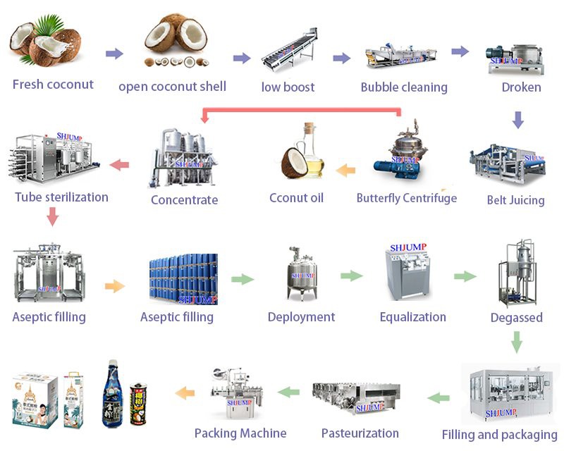 La línea de procesamiento de coco de SHJUMP es adecuada para todo tipo de coco para producir agua de coco, leche de coco, jugo con coco, polvo de coco, etc. Esta línea de procesamiento se combina con pelador, pulverizador, separador de tornillo, filtración, separador centrífugo de disco, sistema de mezcla, desgasificador, homogeneizador, esterilizador, llenador, lavador, autoclave, codificador de tinta, etc. Con una filosofía de diseño avanzada, alto grado de automatización; Los equipos principales están todos hechos de acero inoxidable de grado alimenticio de alta calidad, de acuerdo con los requisitos higiénicos del procesamiento de alimentos.